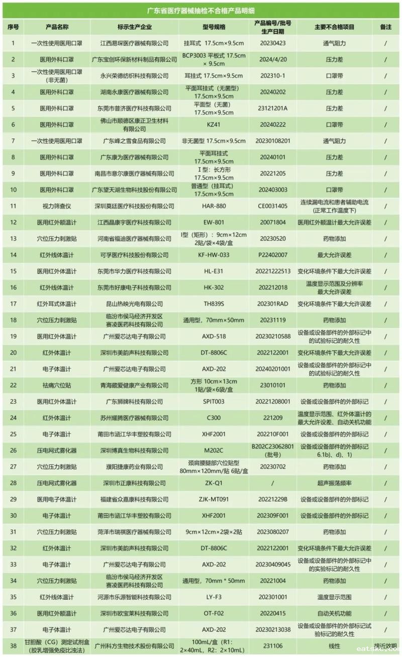 12月31日,广东药监局发布《关于医疗器械抽查检验信息的通告(2024年第5期,总第90期)》,我们通过查看通告中的附件发现,本次共抽查检验了996批次产品,其中有38批次不符合规定,包括医用外科口罩、视力筛查仪、穴位压力刺激贴、医用红外额温计等产品,不符合规定产品具体明细如下: