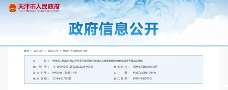 近日,天津市人民政府发布《天津市全链条支持生物医药创新发展的若干措施》(以下简称《若干措施》),以持续增强本市生物医药创新策源与产业化能力,推动生物医药产业高质量发展。