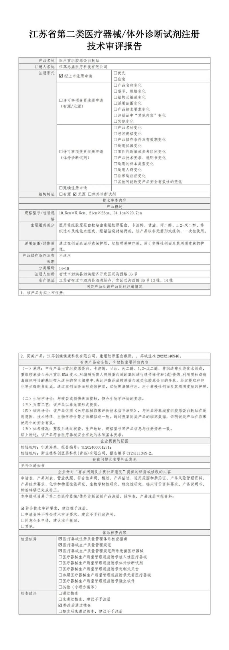 近日,江苏省药监局公布了2025年1月批准注册的手持式生化分析仪、医用重组胶原蛋白敷贴、多参数分析仪、经颅磁刺激仪、婴儿颅骨矫形固定器、医用透明质酸钠敷贴、毫米波治疗仪、医用臭氧治疗仪等161个医疗器械产品目录,同时随附了所有产品的技术审评报告,我们将其中“医用重组胶原蛋白敷贴”的技术审评报告以图片形式转载如下: