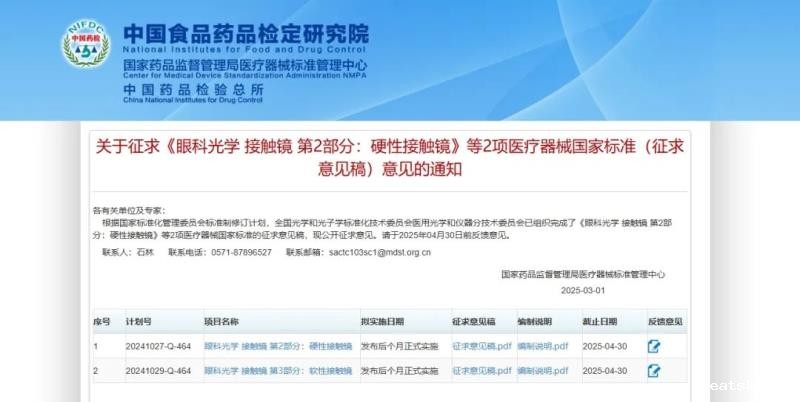 3月1日,国家药监局医疗器械标准管理中心发布《眼科光学 接触镜 第2部分:硬性接触镜》《眼科光学 接触镜 第3部分:软性接触镜》共2项医疗器械国家标准的征求意见稿,并向社会公开求意见。