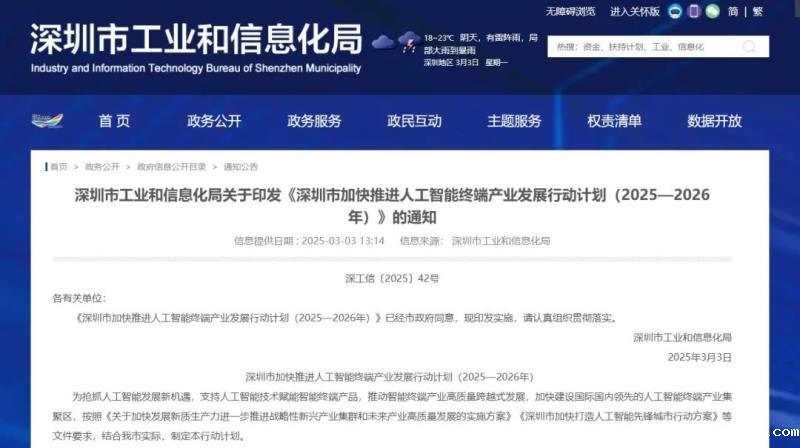 3月3日,深圳市工业和信息化局发布《深圳市加快打造人工智能先锋城市行动计划(2025—2026年)》(以下简称《行动计划》),以抢抓人工智能发展新机遇,支持人工智能技术赋能智能终端产品,推动智能终端产业高质量跨越式发展,加快建设国际国内领先的人工智能终端产业集聚区。