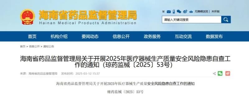 近日,海南省药监局发布《关于开展2025年医疗器械生产质量安全风险隐患自查工作的通知》,以深化医疗器械风险隐患排查治理,进一步落实医疗器械注册人/备案人、生产企业质量安全主体责任,全方位筑牢医疗器械安全底线,切实维护人民群众用械安全。相关工作具体安排如下: