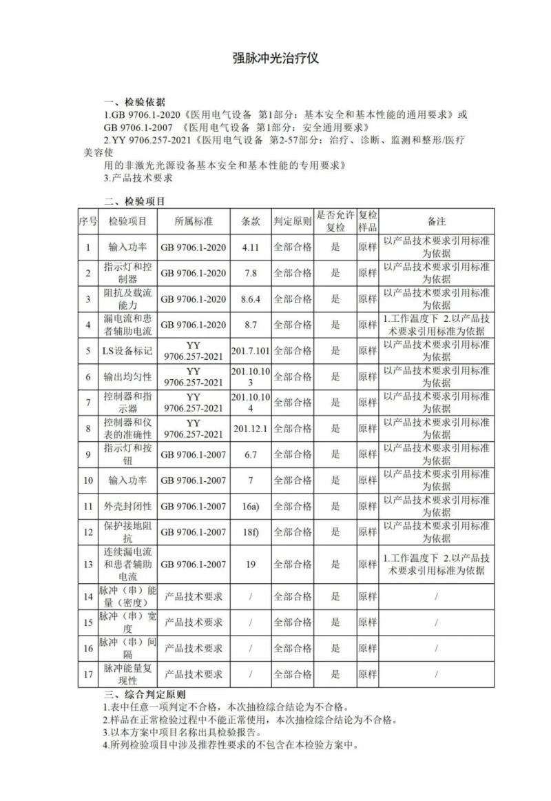 针对强脉冲光治疗仪,国家药监局共提出了漏电流和患者辅助电流、LS设备标记、输出均匀性、脉冲(串)宽度、脉冲(串)间隔等17个检验项目,同时指出,任意一项判定不合格,抽检综合结论即为不合格。具体如下: