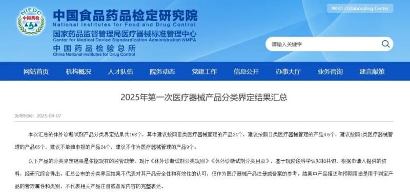 4月7日,国家药监局医疗器械标准管理中心发布《2025年第一次医疗器械产品分类界定结果汇总》,本次汇总的均为体外诊断试剂产品,共有168个,其中建议按照Ⅲ类医疗器械管理的产品24个,建议按照Ⅱ类医疗器械管理的产品46个,建议按照Ⅰ类医疗器械管理的产品65个,建议不单独申报的产品24个,建议不作为医疗器械管理的产品9个。