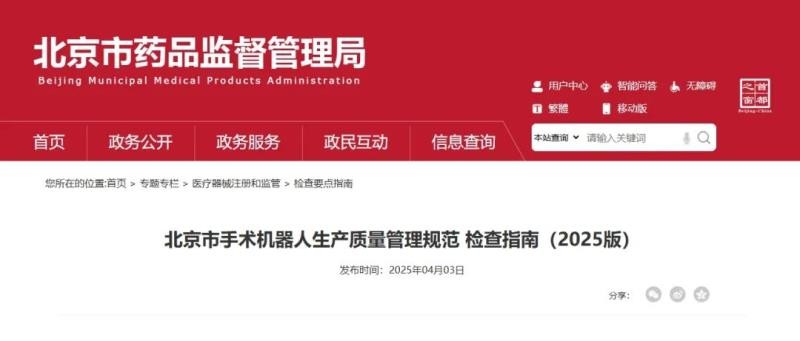 近日,北京市药监局发布《北京市手术机器人生产质量管理规范检查指南(2025版)》(以下简称《指南》),旨在帮助北京市医疗器械生产监管人员增强对手术机器人产品及相关生产质量管理的认知,指导和规范对手术机器人注册人、受托生产企业(以下统称“生产企业”)的监督检查工作,同时为相关生产企业开展生产管理活动提供参考。