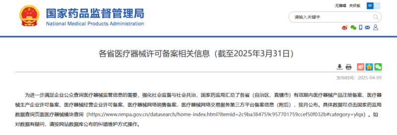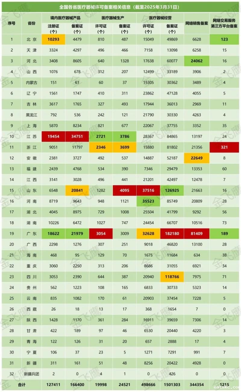 近日,国家药监局公布了截至2025年3月31日各省有效期内医疗器械产品注册备案、医疗器械生产企业许可备案等信息,老规矩,betway必威西盟体育官网入口小编对此稍作编辑,标注红色、绿色、黄色的分别为前三甲。