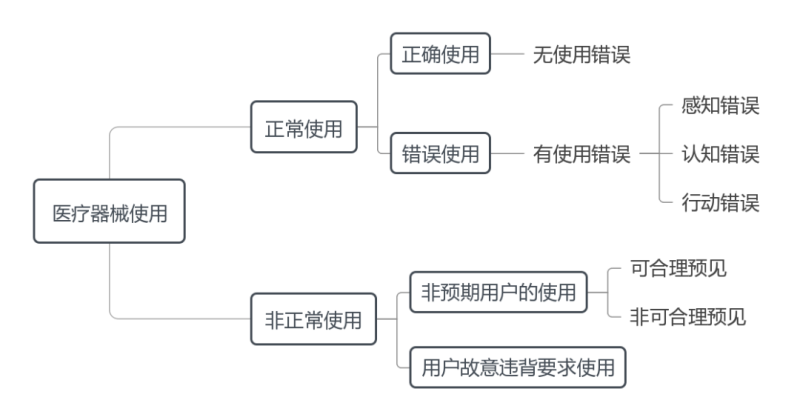 使用错误可分为感知错误、认知错误和行动错误。其中,感知错误是指用户对视觉、听觉、触觉等信息感知失效所致的使用错误,如看错输出结果单位、未听到报警声音等;认知错误是指用户对知识、规则、信息存在记忆、理解等认知失效所致的使用错误,如漏记手术操作步骤、误解符号含义等;行动错误是指用户操作失误、不当等行动失效所致的使用错误,如按错控制按钮、按压力度不够而未激活等。因此,预期的正确使用无使用错误,非预期的正确使用存在使用错误。