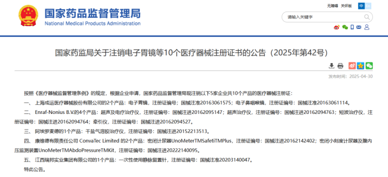 4月30日,国家药监局发布一则医疗器械注册证注销公告,公告显示,该局已依法注销上海成运医疗器械股份有限公司、荷兰恩诺夫尤尼斯有限公司Enraf-Nonius B.V.等5家企业共计10个产品的医疗器械注册证,包括电子胃镜、超声治疗仪、短波治疗仪等产品,具体如下: