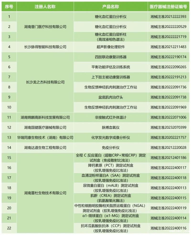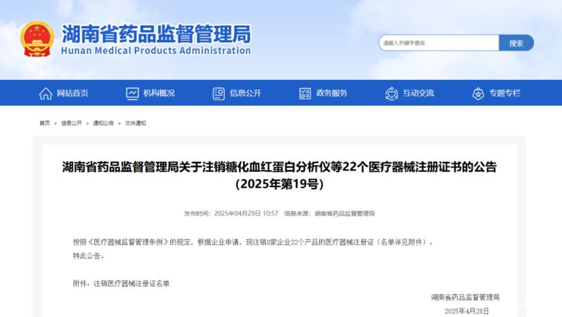 4月29日,湖南省药监局发布公告称,按照《医疗器械监督管理条例》的规定,根据企业申请,现注销湖南普门医疗科技有限公司、湖南雷杜生物技术有限公司等8家企业的22个产品的医疗器械注册证,具体明细如下: