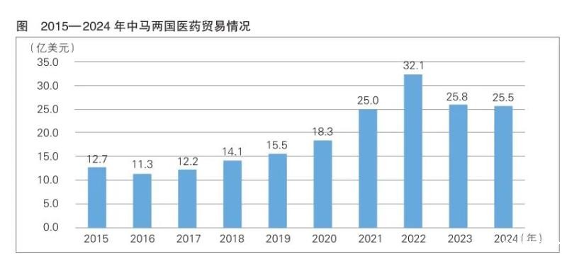 据中国海关统计数据,中马两国医药贸易额由2015年的12.7亿美元,增长至2024年的25.5亿美元(详见下图),10年间复合增长率为7.22%,总体保持增长态势。