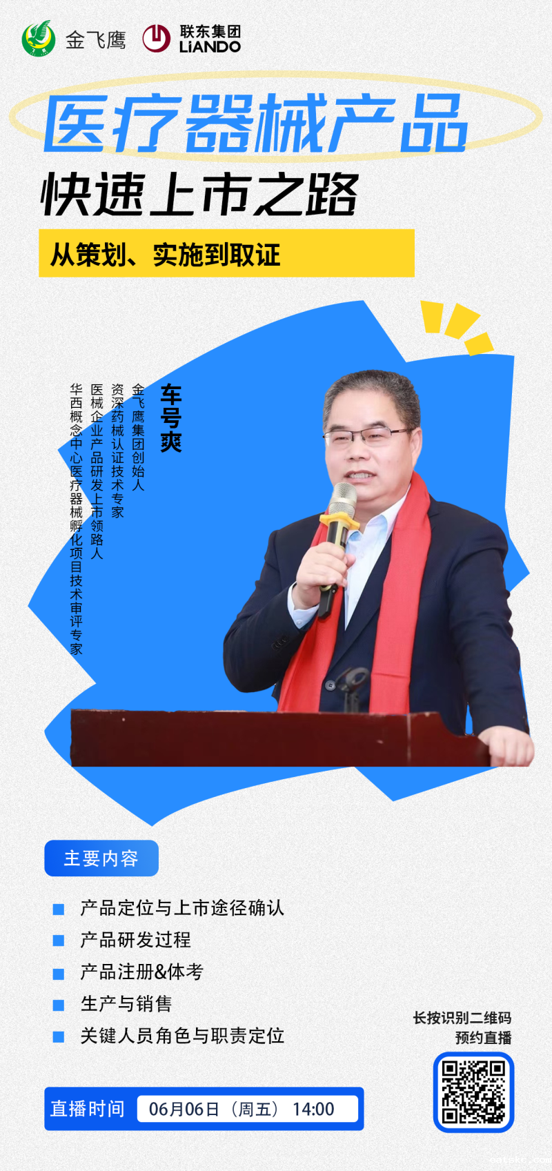 今年4月,betway必威西盟体育官网入口与成都联东U谷联合主办了一场线下培训,得到了园区企业的一致好评。基于前期良好的合作基础,betway必威西盟体育官网入口与联东U谷产业园区的合作进一步深化升级。6月6日,我们将面向全国联东U谷产业园区的医疗器械企业,开展“医疗器械产品快速上市之路”线上专题培训,由集团创始人车号爽老师进行分享,并通过“Betway官网入口登录”视频号同步直播。车老师将结合betway必威西盟体育官网入口18年来积累的4000+成功案例,为企业提供可落地执行的实操指导,帮助企业优化注册申报流程,缩短产品上市周期,提升市场竞争力。
