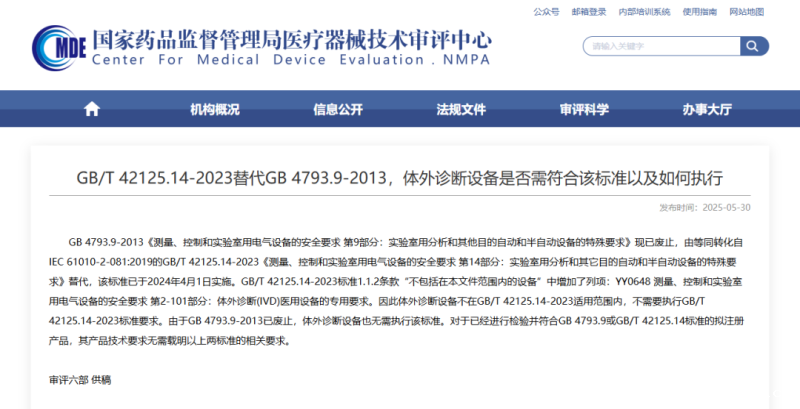 如题,根据国家药监局器审中心的答复,GB 4793.9-2013《测量、控制和实验室用电气设备的安全要求 第9部分:实验室用分析和其他目的自动和半自动设备的特殊要求》现已废止,由等同转化自IEC 61010-2-081:2019的GB/T 42125.14-2023《测量、控制和实验室用电气设备的安全要求 第14部分:实验室用分析和其它目的自动和半自动设备的特殊要求》替代,该标准已于2024年4月1日起实施。