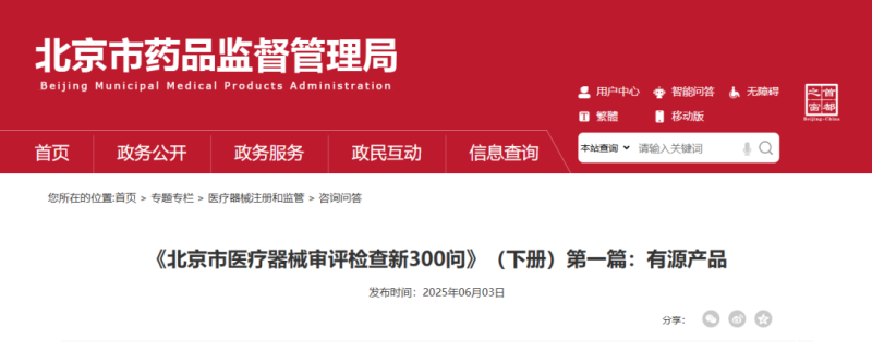 近日,北京市医疗器械审评检查中心持续推出了《北京市医疗器械审评检查新300问》(下册),其中“有源产品”篇共包括22个咨询问答,我们将其转载如下,有源企业别忘收藏备用哦~