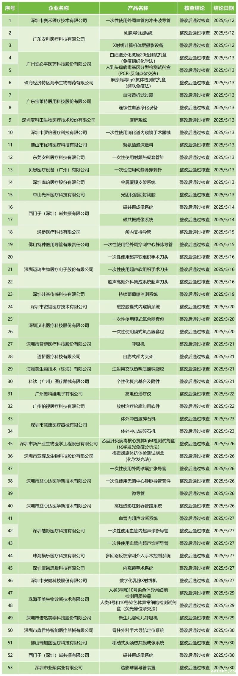 6月27日,广东省药监局官网公布2025年5月医疗器械注册质量管理体系核查结果,包括深圳硅基传感科技有限公司的持续葡萄糖监测系统、海雅美生物技术(珠海)有限公司的注射用交联透明质酸钠凝胶、广州奥科维电子有限公司的高电位治疗仪、广州柏视医疗科技有限公司的放射治疗轮廓勾画软件等共计53款产品,均为“整改后通过核查”。具体明细见下方表格: