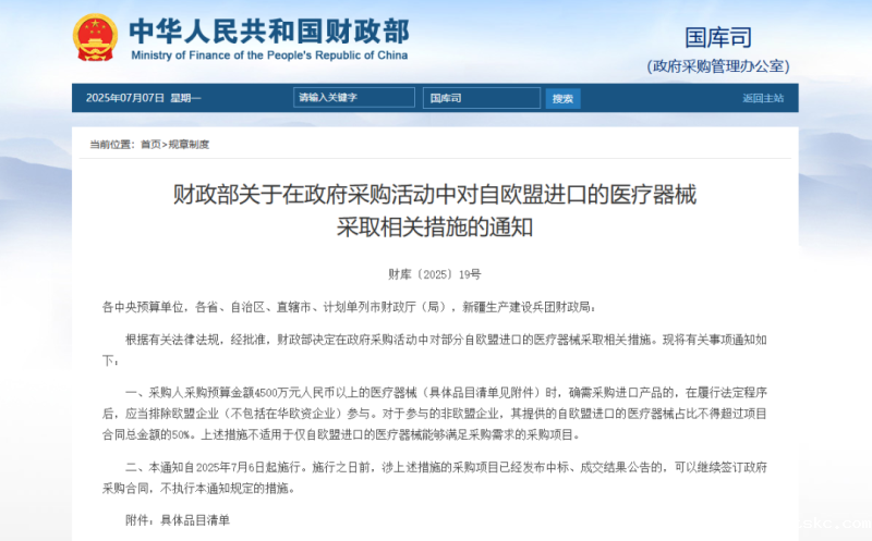 7月6日,国家财政部发布《关于在政府采购活动中对自欧盟进口的医疗器械采取相关措施的通知》,具体通知事项如下: