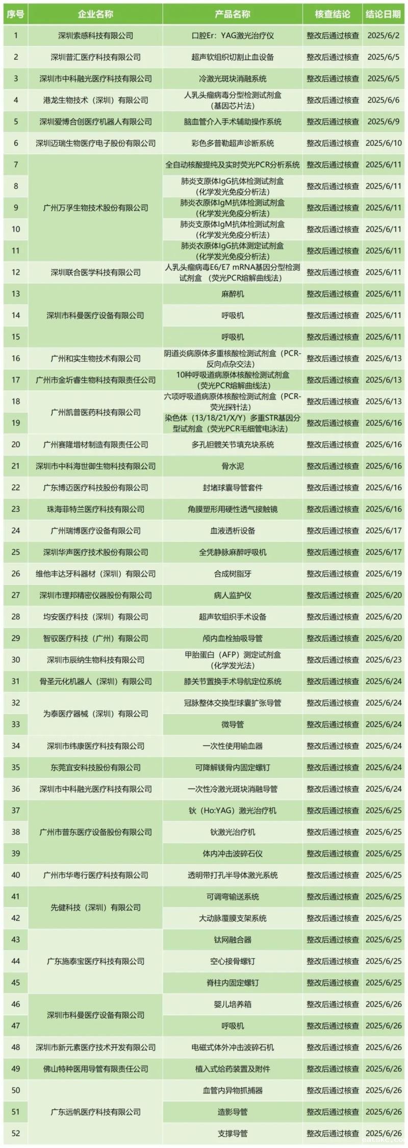 7月16日,广东省药监局官网公布2025年6月医疗器械注册质量管理体系核查结果,包括深圳索感科技有限公司的口腔Er:YAG激光治疗仪、广州万孚生物技术股份有限公司的全自动核酸提纯及实时荧光PCR分析系统、广州市普东医疗设备股份有限公司的钬(Ho:YAG)激光治疗机、深圳市科曼医疗设备有限公司的呼吸机等共计52款产品,均为“整改后通过核查”。具体明细见下方表格:
