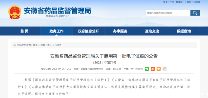 电子证照同步在安徽省药品监督管理局门户网站电子证照公示栏目(https://mpa.ah.gov.cn)公示。该公告同时提到,电子证照启用前该局已颁发的相关纸质证书(含正本、副本、附页和变更记录页),在有效期内继续使用。