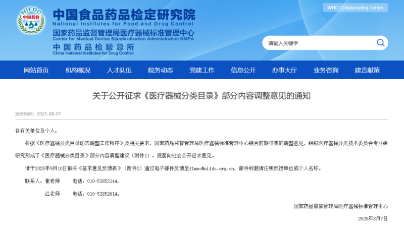 8月7日,国家药品监督管理局医疗器械标准管理中心发布《医疗器械分类目录》部分内容调整建议,并向社会公开征求意见。