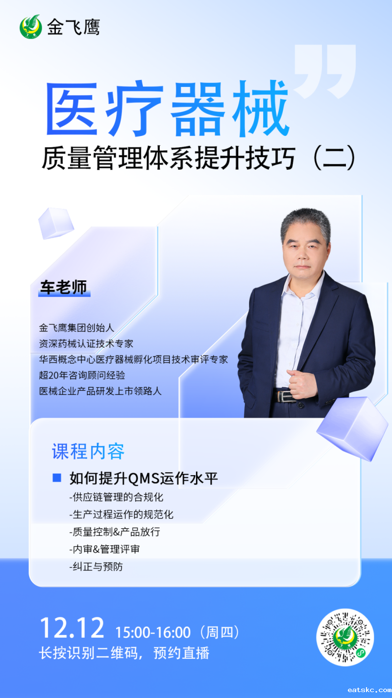 此前我们已为大家带来新版医疗器械生物学评价标准、新版医疗器械风险管理标准、医疗器械软件注册、新版医疗器械经营质量管理规范等共计106次线上培训课程,有兴趣的可点击视频号直播回放进行查看~另外大家也一定很关注接下来的培训主题,相关培训预告我们会陆续添加至视频号,请大家持续关注哦!