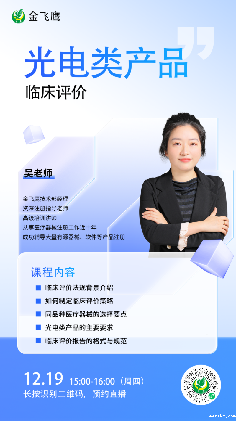 根据betway必威西盟体育官网入口近18年的医疗器械注册辅导经验总结,临床评价资料一直是让企业最为头疼的项目,资料的不完善会直接导致注册周期的延长。经常关注我们的朋友也许还记得,此前我们跟大家分享过几期有关医疗器械临床评价的内容(点击视频号主页可观看回放),那么本期培训,我们在带大家一起回顾临床评价基础知识的同时,主要偏向于光电类产品的临床评价,结合我们辅导过的光电类产品案例进行讲解,从而给此类企业临床评价提供更多实用参考。12月19日下午3点,betway必威西盟体育官网入口技术部经理、从事医疗器械注册工作近十年的吴老师给大家带来《光电类产品临床评价》,培训内容包括临床评价法规背景介绍、如何制定临床评价策略、同品种医疗器械的选择要点、光电类产品的临床评价要求、临床评价报告的格式与规范,想听课的朋友记得提前预约!