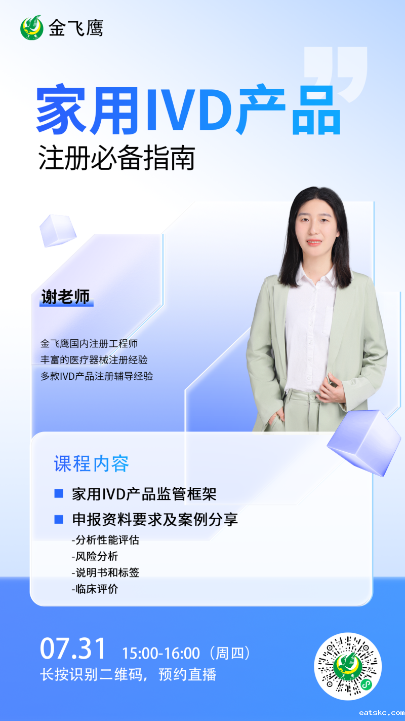 7月31日下午3点,betway必威西盟体育官网入口国内注册工程师、有着多款IVD产品注册辅导经验的谢老师给大家带来《家用IVD产品注册必备指南》,她将结合具体案例,拆解分析性能评估(如何确保性能不会受到非专业检测环境的明显影响)、说明书标签设计(防误操作警示标识设置)等关键环节,手把手指导企业规避高频发补风险。这场培训将为您揭开家用IVD注册的“隐形门槛”,助力产品快速获批、抢占市场先机,感兴趣的朋友记得提前预约!