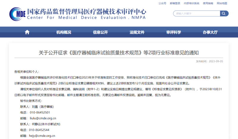 9月5日,国家药监局器审中心发布《医疗器械临床试验质量技术规范》《体外诊断试剂临床试验质量技术规范》共2项行业标准征求意见稿,并向社会公开征求意见。