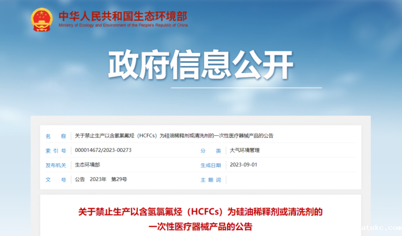 近日,国家生态环境部发布《关于禁止生产以含氢氯氟烃(HCFCs)为硅油稀释剂或清洗剂的一次性医疗器械产品的公告》,具体内容如下: