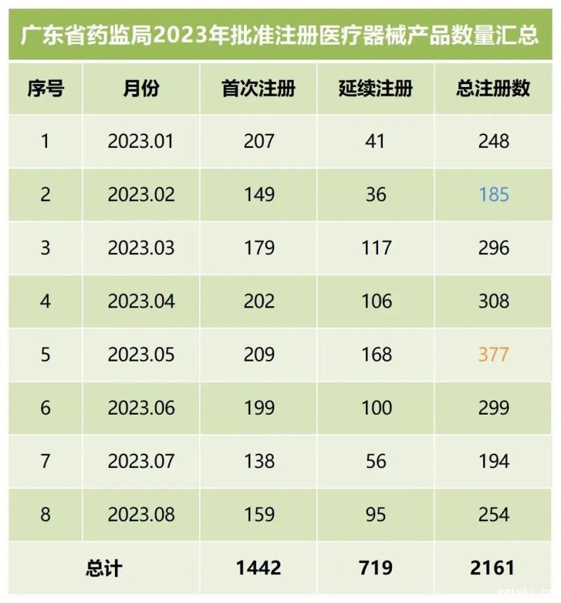 我们同步汇总了2023年各个月份广东省药监局批准注册的医疗器械产品数量(见下方表格),从表格中可以看出,截至8月底,2023年广东药监局总计批准注册第二类医疗器械产品2161个,其中首次注册1442个,延续注册719个。