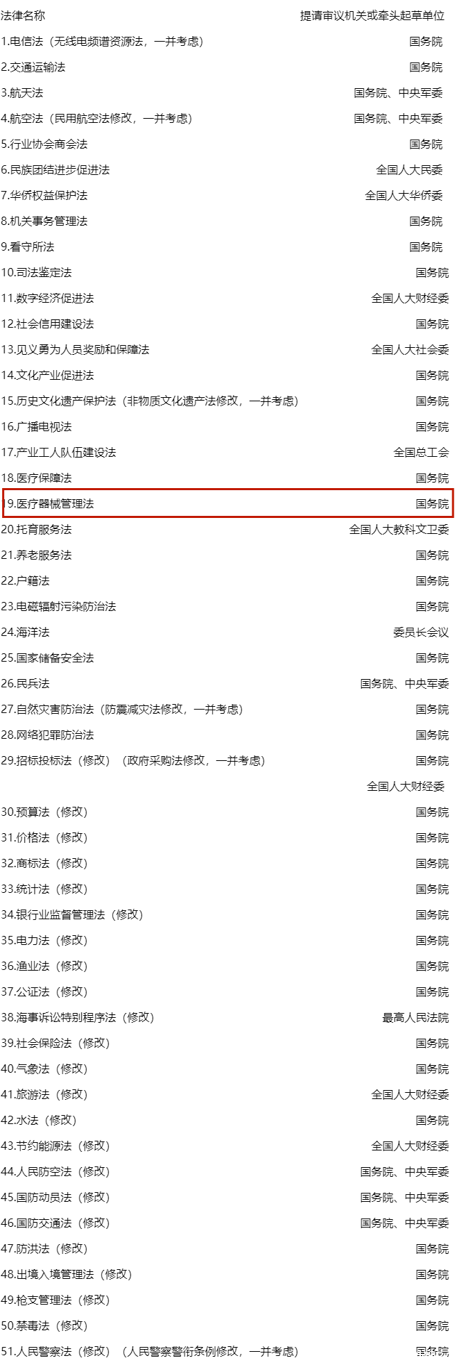 近日,《十四届全国人大常委会立法规划》公布,在第二类“需要抓紧工作、条件成熟时提请审议的法律草案”项目中,医疗器械管理法首次被列入立法规划。