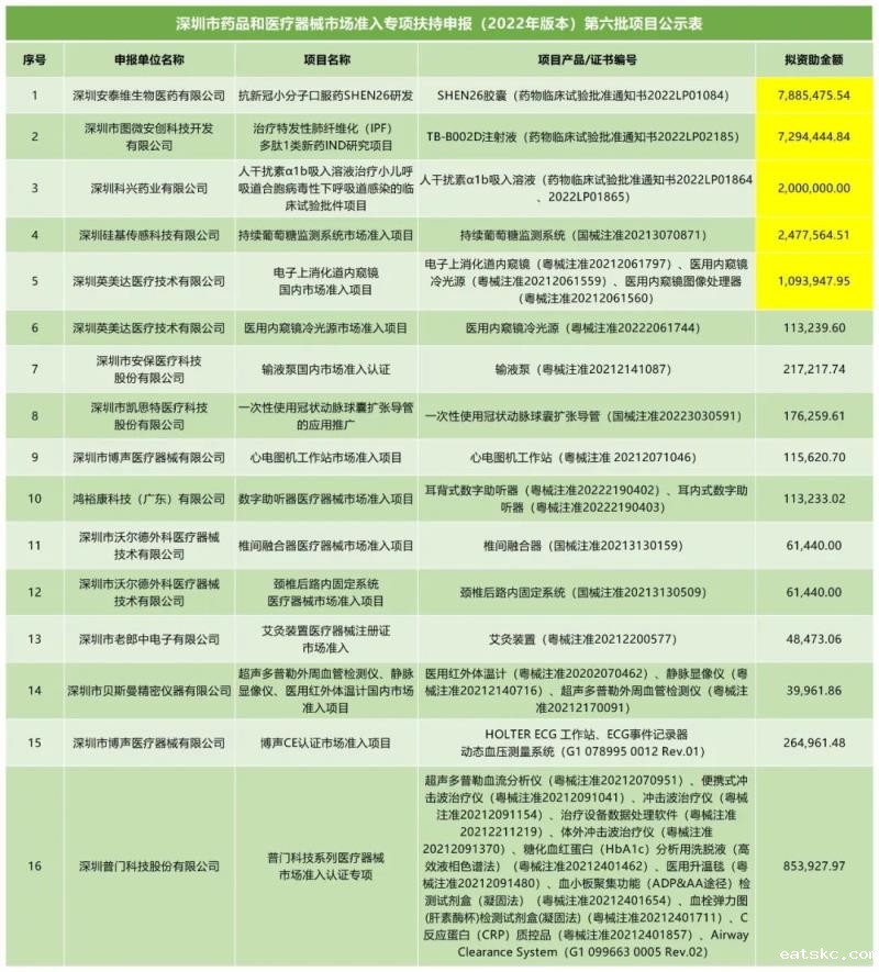 近日,深圳市发展和改革委员会官网发布《深圳市药品和医疗器械市场准入专项扶持申报(2022年版本)第六批拟资助项目的公示》,包括深圳市贝斯曼精密仪器有限公司的超声多普勒外周血管检测仪/静脉显像仪/医用红外体温计国内市场准入项目、深圳市沃尔德外科医疗器械技术有限公司的椎间融合器/颈椎后路内固定系统医疗器械市场准入项目、深圳市老郎中电子有限公司的艾灸装置医疗器械注册证市场准入等在内的共计16个项目,其中拟资助金额最高为788万余元,而100万元以上的共有5个项目(已用黄色标注),具体明细如下: