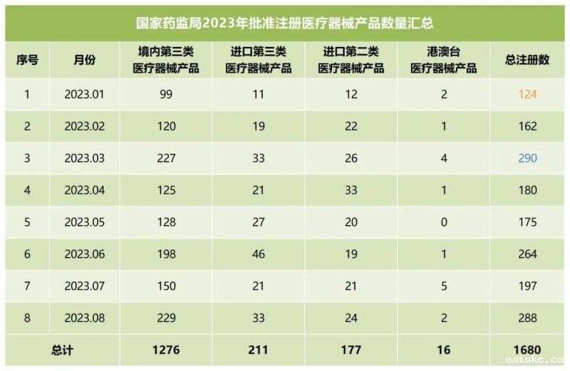 我们同步汇总了2023年各个月份国家药监局批准注册的医疗器械产品数量(见下方表格),从表格中可以看出,截至8月,2023年国家药监局总计批准注册医疗器械产品1680个,其中境内第三类医疗器械产品1276个,进口第三类医疗器械产品211个(第三类医疗器械产品总计1487个),进口第二类医疗器械产品177个,港澳台医疗器械产品16个。