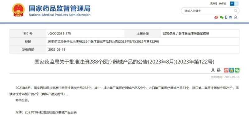据国家药监局官网近日发布,2023年8月,国家药监局共批准注册医疗器械产品288个。其中,境内第三类医疗器械产品229个,进口第三类医疗器械产品33个,进口第二类医疗器械产品24个,港澳台医疗器械产品2个。