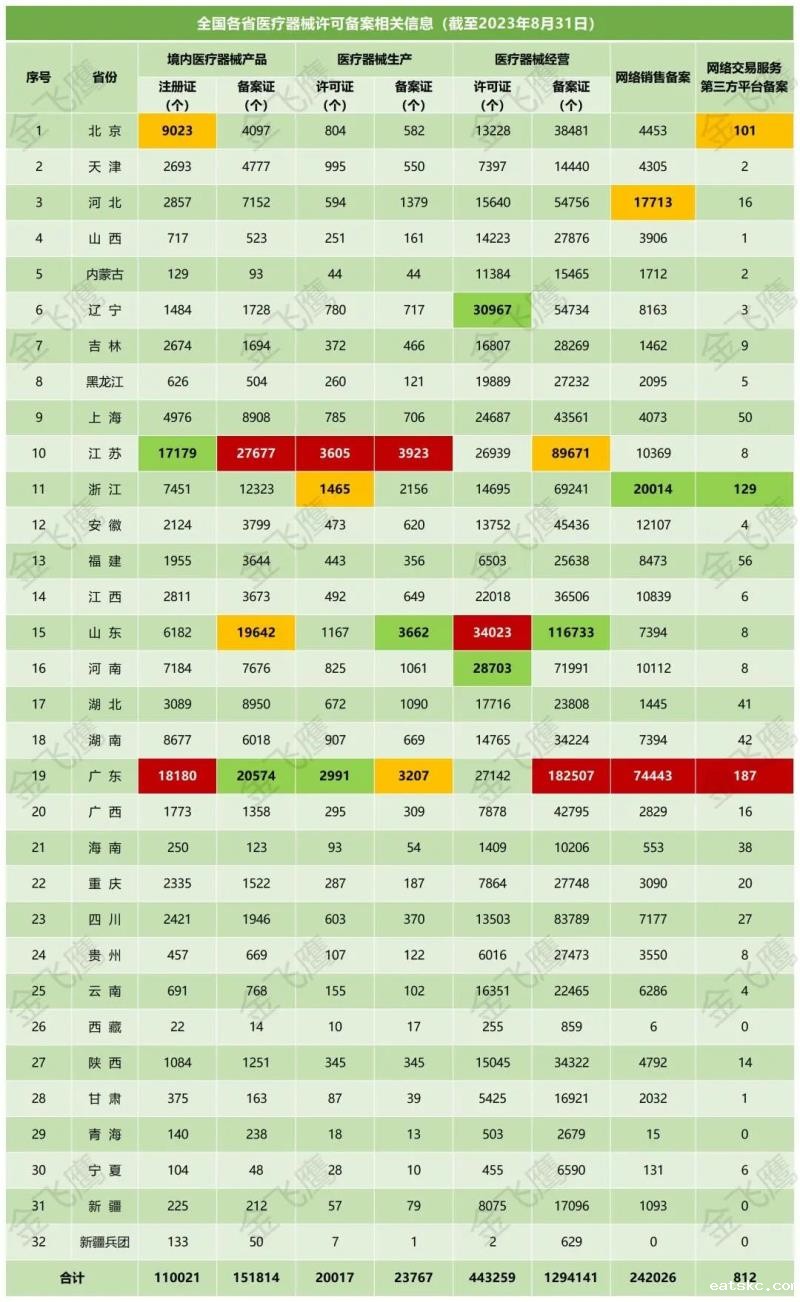 9月12日,国家药监局公布了截至2023年8月31日各省有效期内医疗器械产品注册备案、医疗器械生产企业许可备案等信息,老规矩,betway必威西盟体育官网入口小编对此稍作编辑,标注红色、绿色、黄色的分别为前三甲。