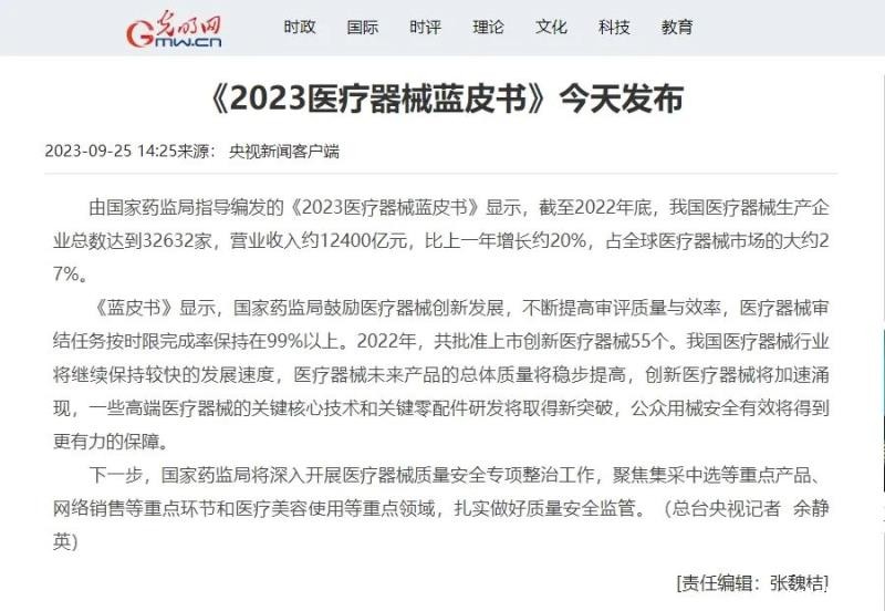 近日,由国家药监局指导编发的《2023 医疗器械蓝皮书》显示,截至 2022 年底,我国医疗器械生产企业总数达到 32632 家,营业收入约 12400 亿元,比上一年增长约 20%,占全球医疗器械市场的大约 27%。