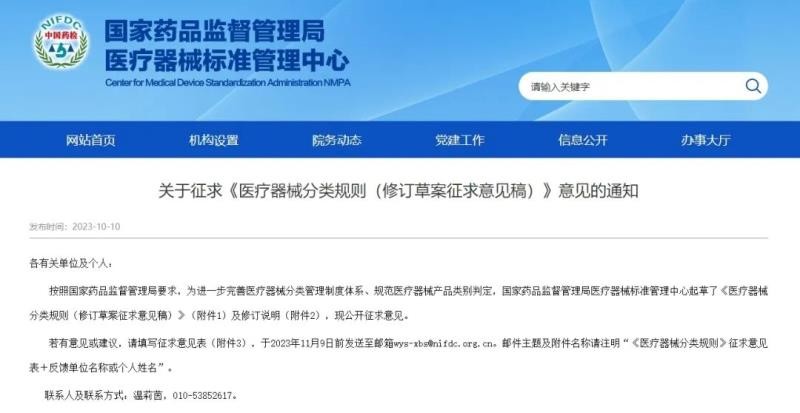 10月10日,国家药监局医疗器械标管中心发布《医疗器械分类规则(修订草案征求意见稿)》(以下简称《修订草案》),并向社会公开征求意见。
