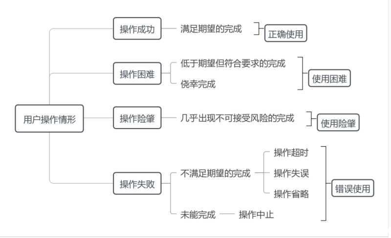 使用错误是指可能导致错误使用的潜在根源,可分为感知错误、认知错误和行动错误。其中,感知错误是指用户对视觉、听觉、触觉等信息感知失效所致的使用错误,如看错输出结果单位、未听到报警声音等;认知错误是指用户对知识、规则、信息存在记忆、理解等认知失效所致的使用错误,如漏记手术操作步骤、误解符号含义等;行动错误是指用户操作失误、不当等行动失效所致的使用错误,如按错控制按钮、按压力度不够而未激活等。