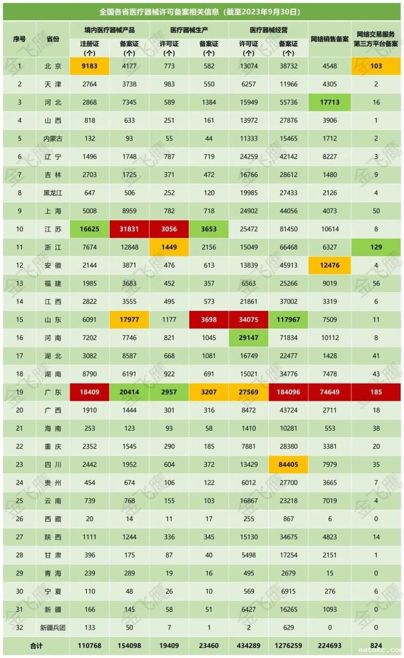 10月18日,国家药监局公布了截至2023年9月30日各省有效期内医疗器械产品注册备案、医疗器械生产企业许可备案等信息,老规矩,betway必威西盟体育官网入口小编对此稍作编辑,标注红色、绿色、黄色的分别为前三甲。