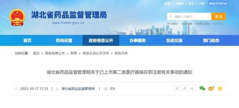 10月17日,湖北省药监局官网发布《关于已上市第二类医疗器械在鄂注册有关事项的通知》,具体内容如下:
