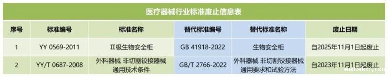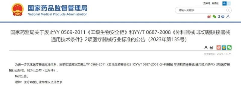10月25日,国家药监局官网发布公告称,废止YY 0569-2011《Ⅱ级生物安全柜》和YY/T 0687-2008《外科器械 非切割铰接器械 通用技术条件》2项医疗器械行业标准,除附件中公布的废止日期外,我们同步整理了此两项标准废止后的替代标准,具体如下: