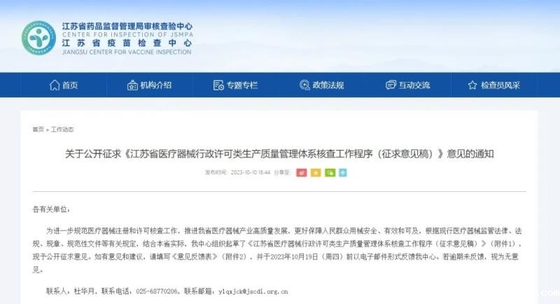 近日,江苏省药监局审核查验中心发布《江苏省医疗器械行政许可类生产质量管理体系核查工作程序(征求意见稿)》(以下简称《工作程序》),并向社会公开征求意见。