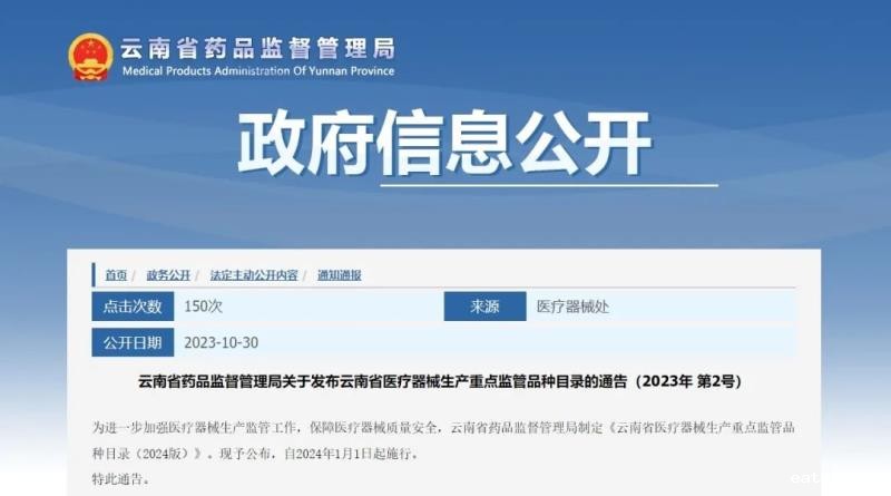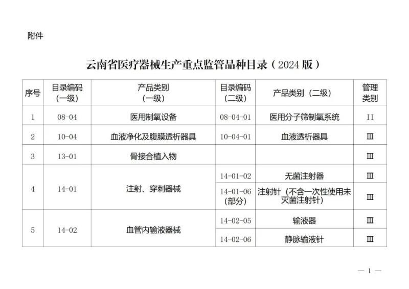 10月30日,云南省药监局官网公布《云南省医疗器械生产重点监管品种目录(2024版)》(以下简称《目录》),其中包括医用分子筛制氧系统、创面敷贴等7种Ⅱ类产品及血液透析器具、无菌注射器等9种Ⅲ类产品。《目录》自2024年1月1日起施行,以下为具体清单: