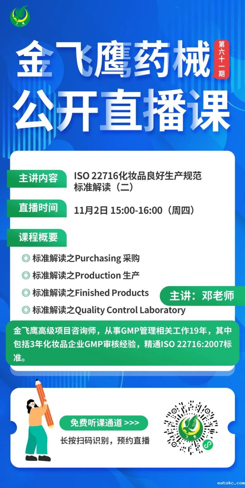 11月2日下午3点,betway必威西盟体育官网入口高级项目咨询师,从事GMP管理相关工作19年,其中包括3年化妆品企业GMP审核经验的邓老师,给大家带来《ISO 22716化妆品良好生产规范标准解读(二)》,继续给大家详细解读标准的采购、生产、成品、外包、投诉和召回等版块,大家千万不要错过了哦!