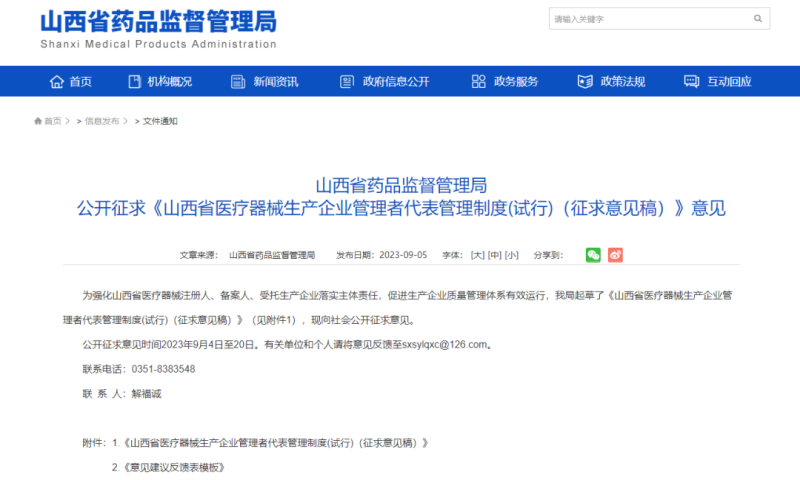 近日,山西省药监局官网发布《山西省医疗器械生产企业管理者代表管理制度(试行)(征求意见稿)》(以下简称《征求意见稿》),并向社会公开征求意见。