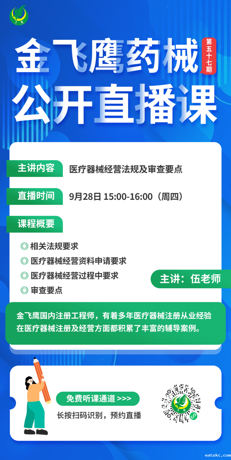 9月28日下午3点,betway必威西盟体育官网入口国内注册工程师,有着多年医疗器械注册从业经验,在医疗器械注册及经营方面都积累了丰富辅导案例的伍老师,给大家带来《医疗器械经营法规及审查要点》,培训内容包括相关法规要求、医疗器械经营资料申请要求、医疗器械经营过程中要求、审查要点等,大家千万不要错过了哦!