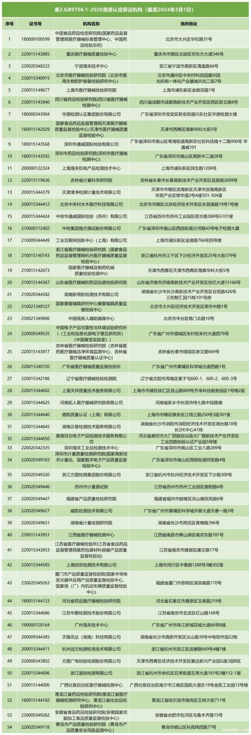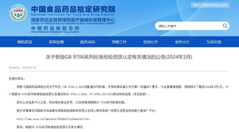 3月4日,中检院官网公布了截至2024年3月1日,75个新版GB 9706系列标准检验资质认定情况和GB 9706.1-2020、YY 9706.102-2021获证机构信息。我们从附件表格中可以看到,全国共有108家GB 9706.1-2020资质认定获证机构,也就是说,可以承担新标的安规检测工作,具体如下: