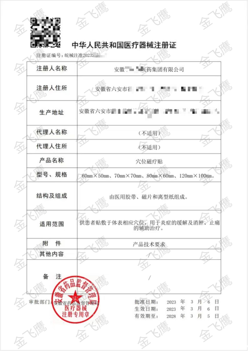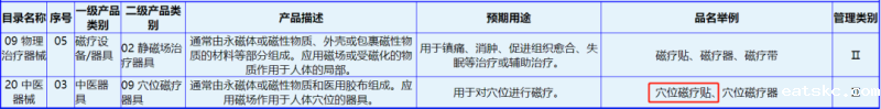 穴位磁疗贴属于磁疗产品这个大类,它是指利用磁场的物理性能治疗或缓解人体疾病的医疗器械。虽然磁疗也是物理治疗方式的一种,但因为本期取证产品名称有一个前缀“穴位”,便被划分到了“中医器械”范畴,分类编码20-03-09(未被应用在穴位的磁疗贴分类编码则为09-05-02)。