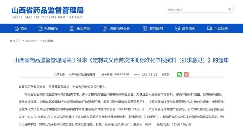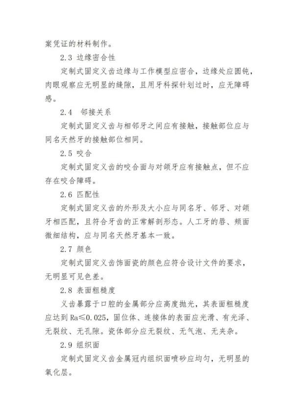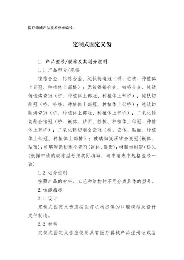 近日,山西省药监局发布《定制式义齿首次注册标准化申报资料(征求意见)》,共包括《定制式义齿首次注册申报资料要求及说明》《定制式义齿符合性声明产品风险管理资料》《医疗器械安全和性能基本原则清单》《定制式固定义齿产品技术要求》《定制式活动义齿产品技术要求》《定制式固定义齿说明书和最小销售单元标签样稿》《定制式活动义齿说明书和最小销售单元标签样稿》8份附件,我们将其中定制式固定义齿产品技术要求》转载如下,以供相关企业参考: