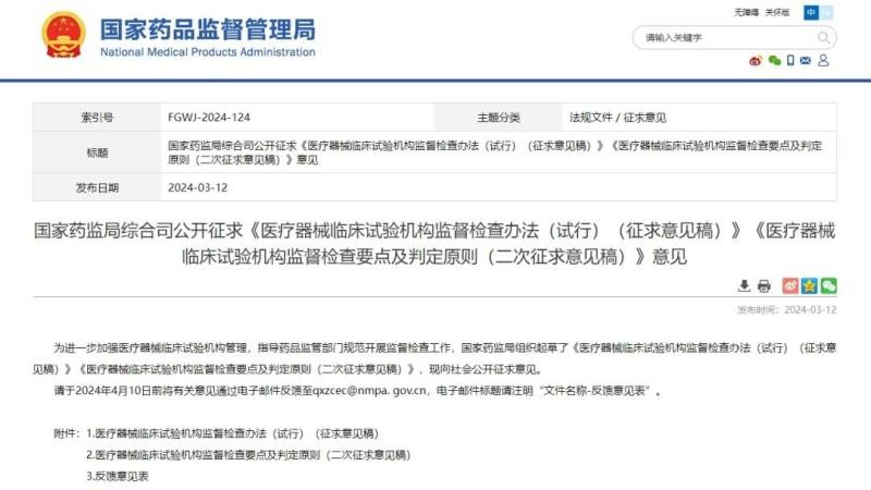 3月12日,国家药监局发布《医疗器械临床试验机构监督检查办法(试行)(征求意见稿)》《医疗器械临床试验机构监督检查要点及判定原则(二次征求意见稿)》,并向社会公开征求意见。