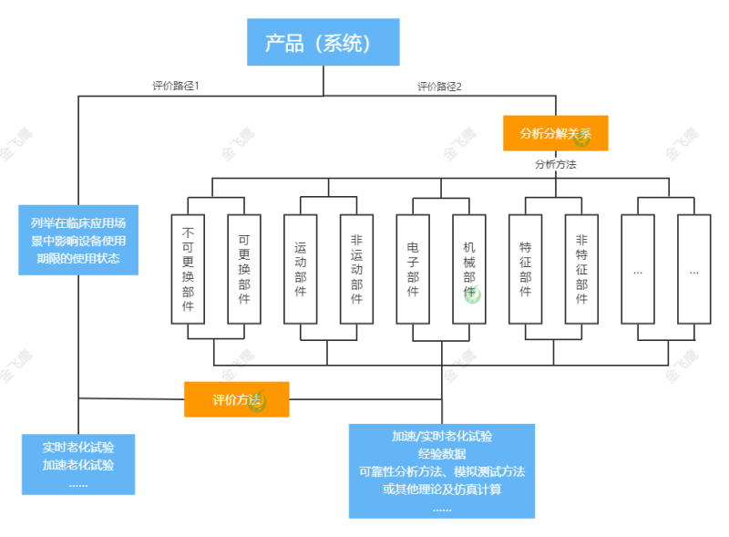 2)通过将产品(系统)分解为不同子系统/部件的方式进行评价。首先应详细分析分解关系,在此基础上通过不同的分解方式(如将产品分为关键部件及非关键部件和/或特征部件及非特征部件和/或可更换部件及不可更换部件和/或运动部件及非运动部件和/或电子部件及机械部件等)确定产品的使用期限。