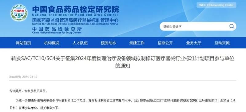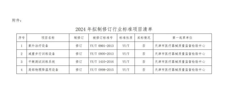 3月19日,国家药监局医疗器械标管中心转发了全国医用电器标准化技术委员会物理治疗设备分技术委员会《关于征集2024年度物理治疗设备领域拟制修订医疗器械行业标准计划项目参与单位的通知》,2024年拟对紫外治疗设备、减重步行训练设备、平衡测试训练系统、局部物理降温用设备的行业标准进行制修订,具体如下: